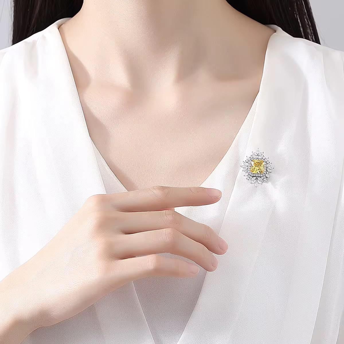 Rafinată și luminoasă, această broșă este alegerea perfectă pentru femeia care iubește eleganța discretă, dar cu impact vizual. Designul său floral–geometric pune în valoare un cristal central galben intens, cu tăietură pătrată, ce captează lumina și atrage privirile prin strălucirea sa caldă.
