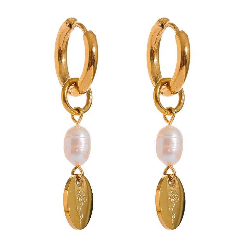 Acești cercei aurii îmbină armonios delicatețea perlei cu un detaliu modern: un bănuț metalic cu finisaj texturat. Designul lor minimalist, dar sofisticat, îi face alegerea perfectă pentru femeile care apreciază bijuteriile discrete cu impact.
