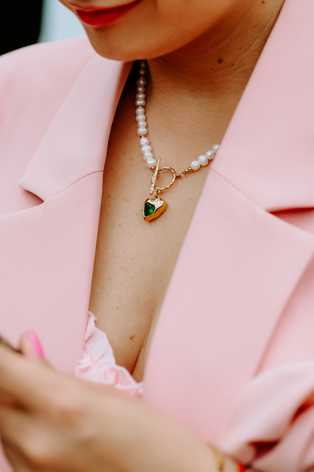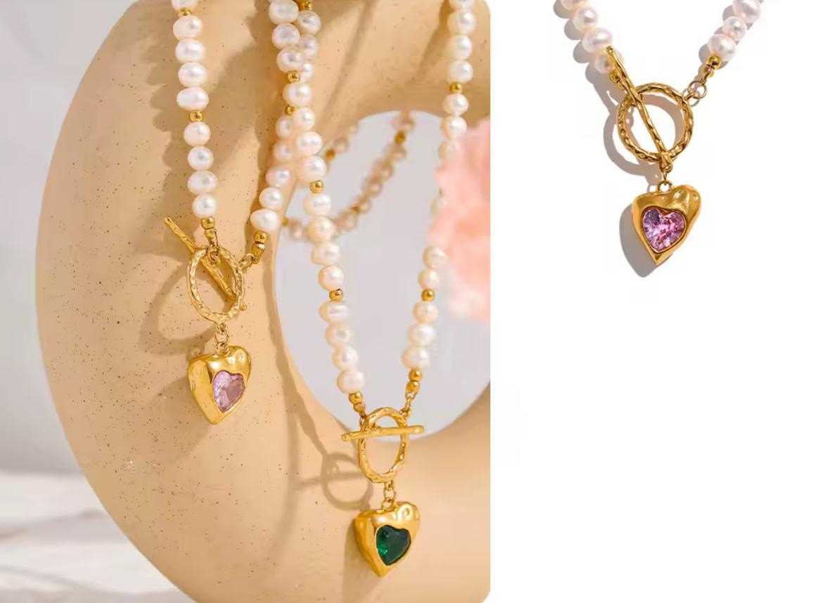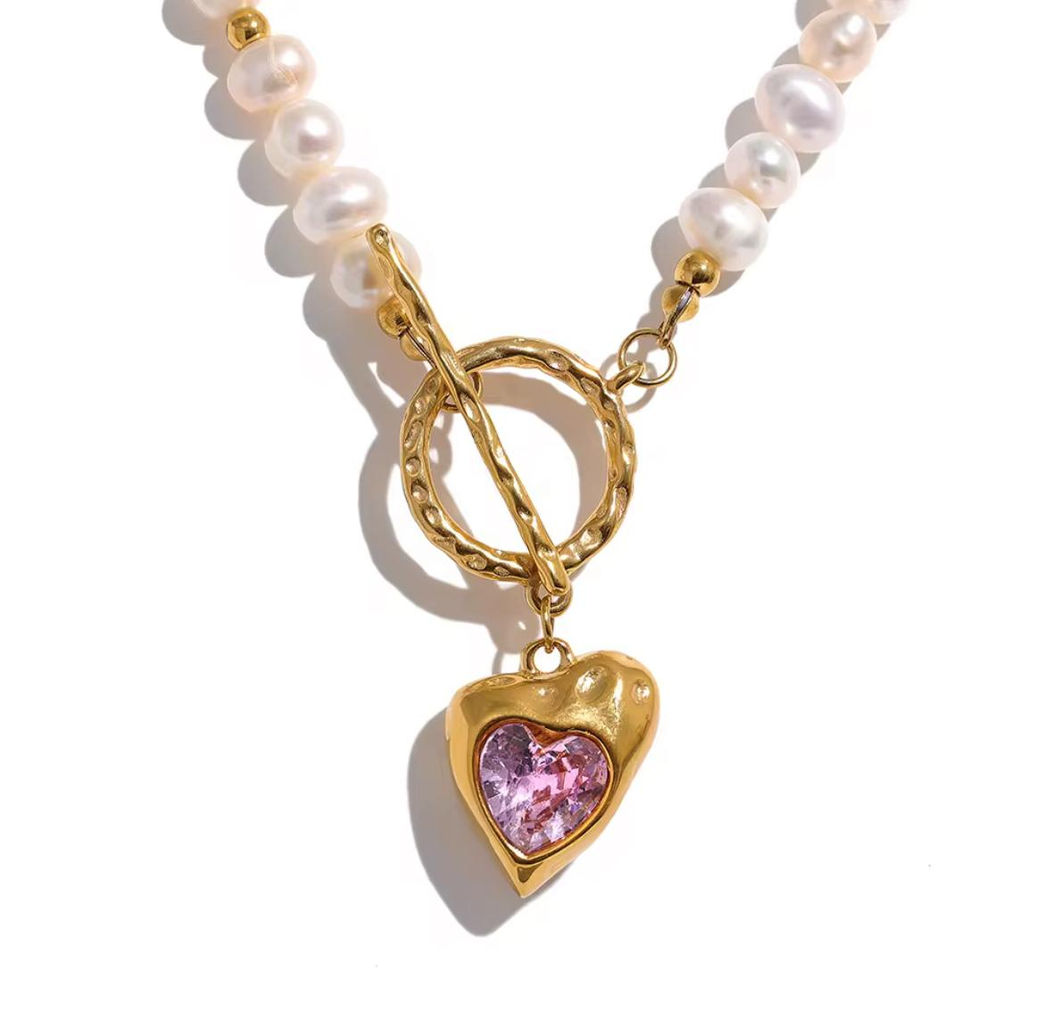 Colier cu Perle de Cultură și Pandantiv Inimă cu Zirconiu Roz – Placat cu Aur 18K