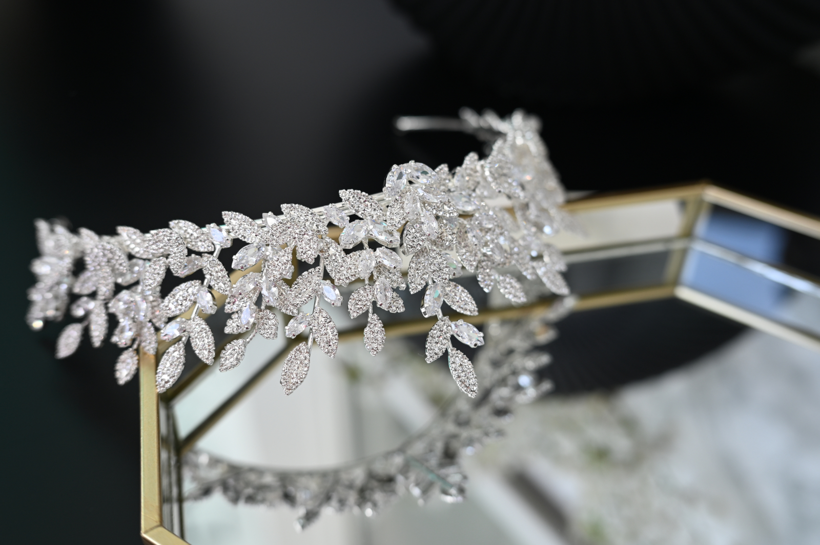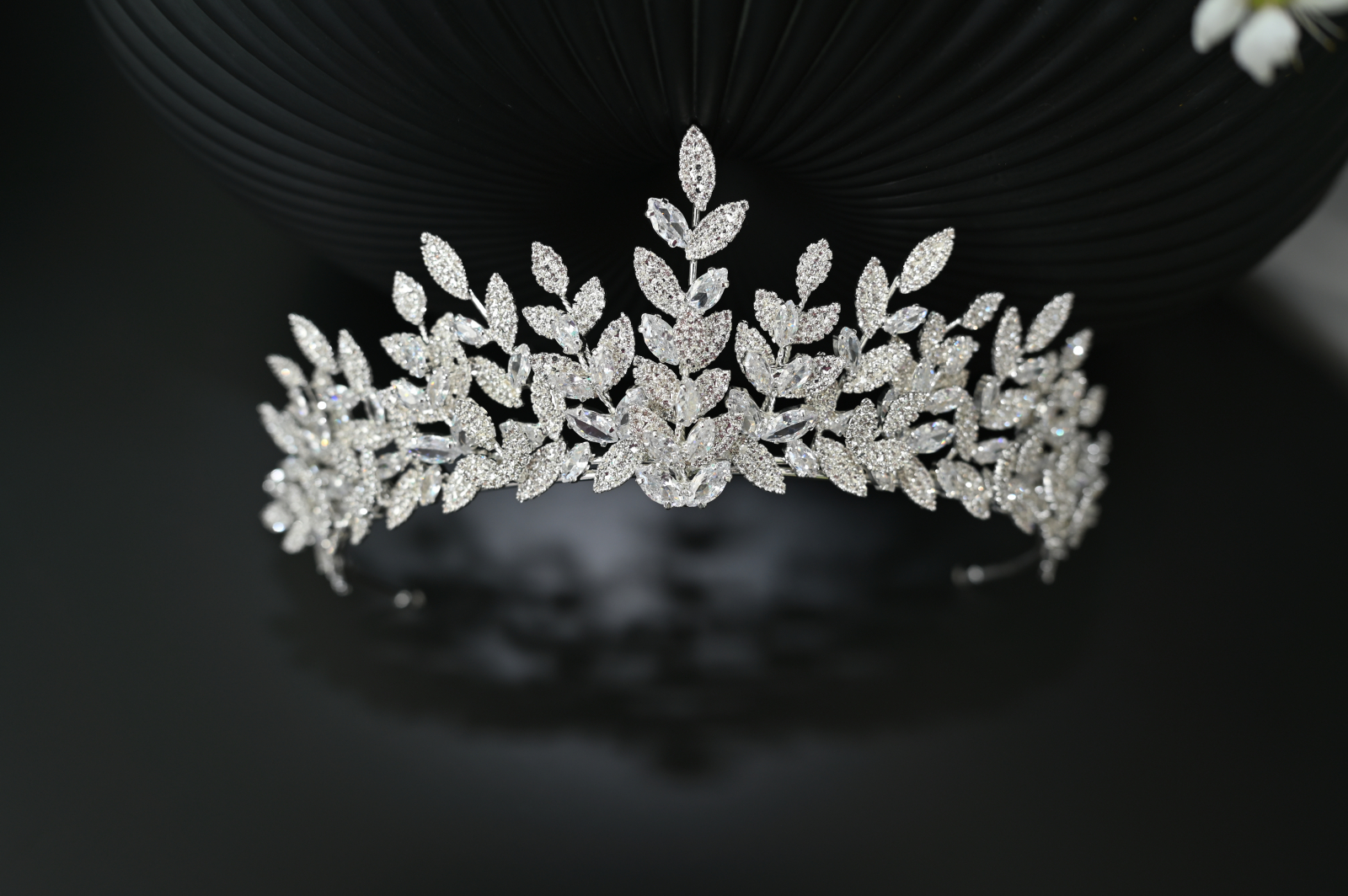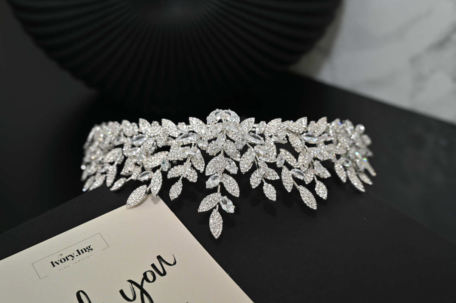 Cristalele sunt atent aranjate pentru a imita delicatețea frunzelor, iar unele sunt tăiate în formă de lacrimă, oferind un efect sofisticat și regal. Strălucirea sa intensă o face ideală pentru o mireasă care își dorește un accesoriu statement, dar elegant.